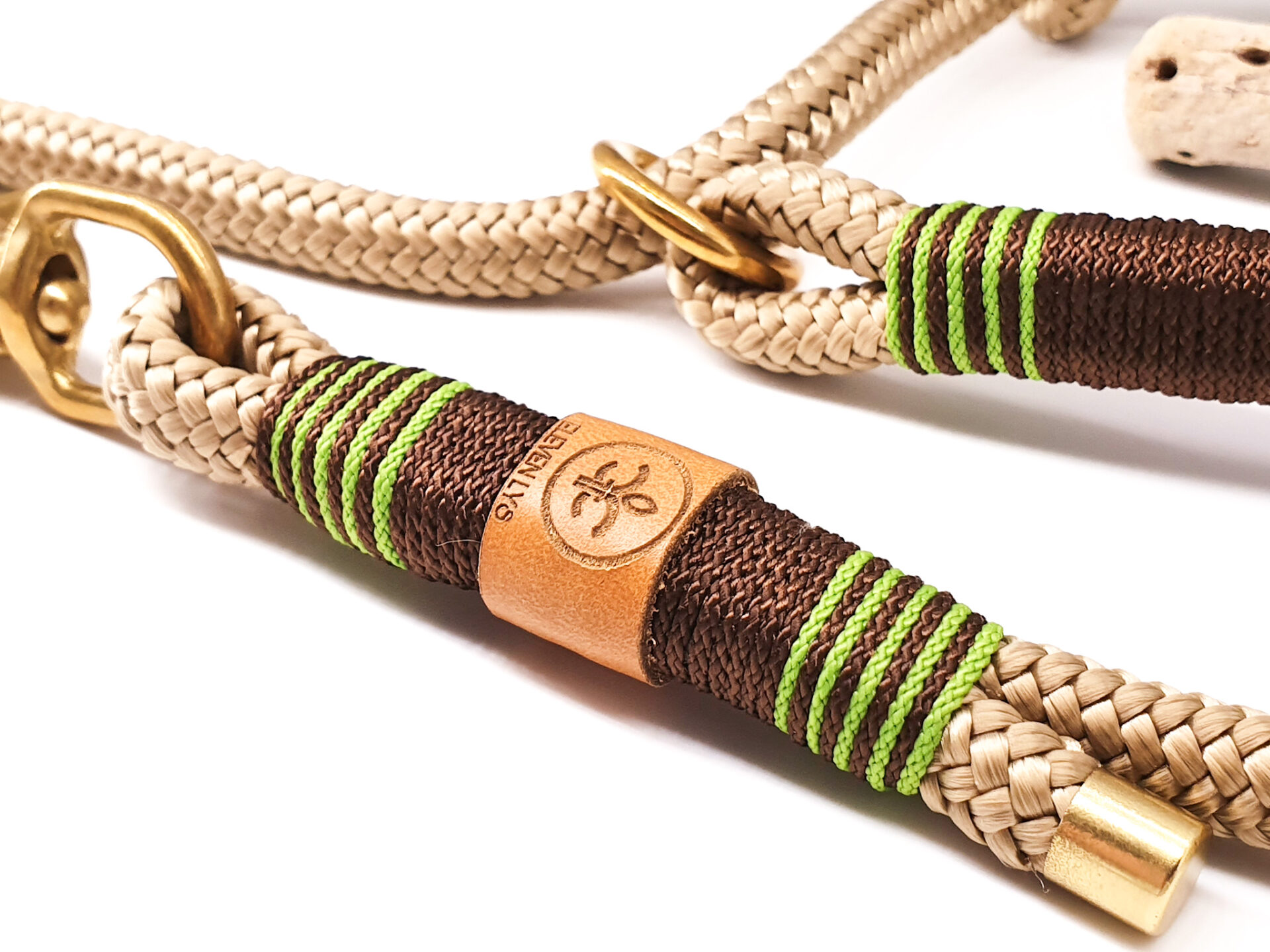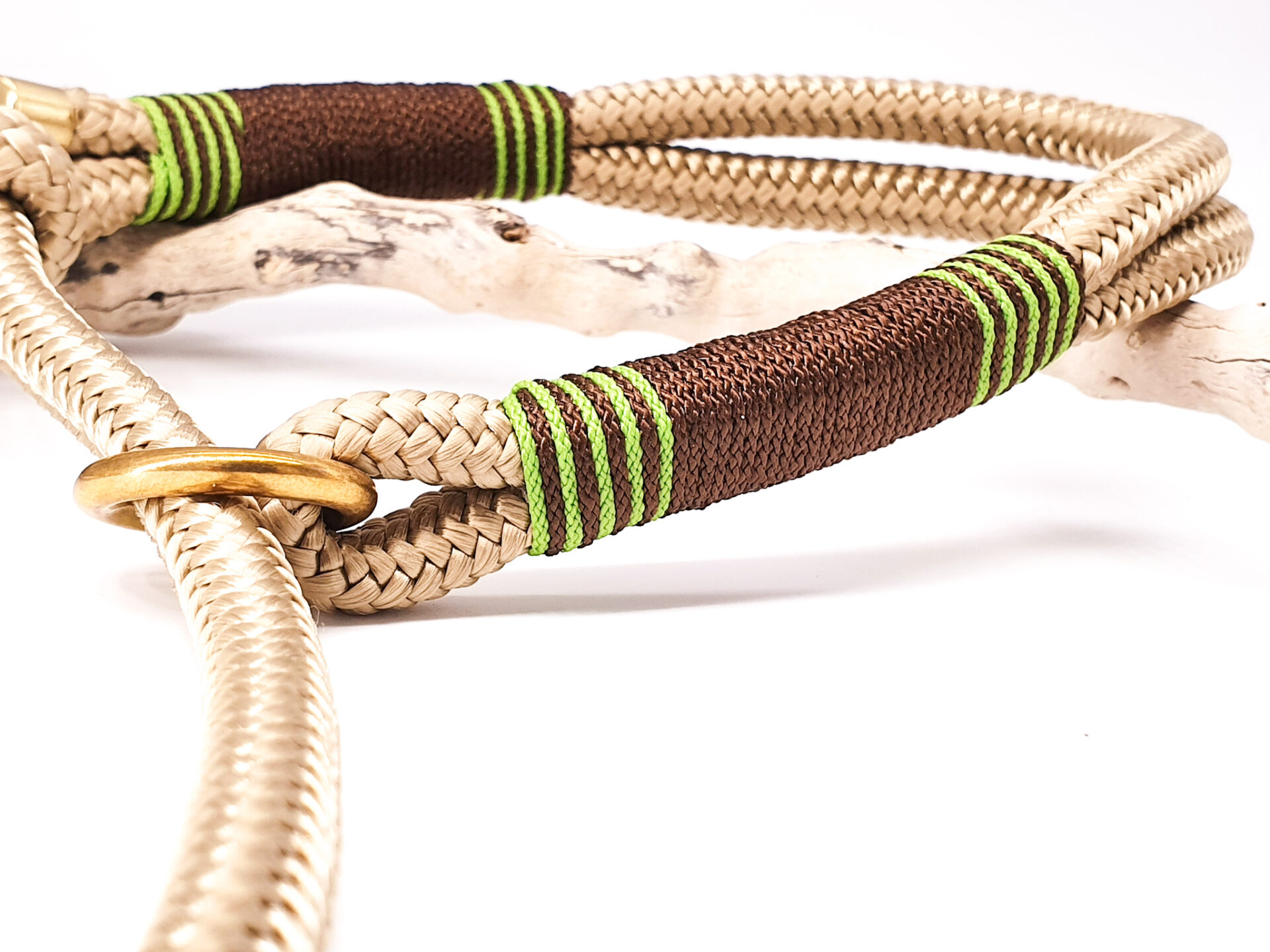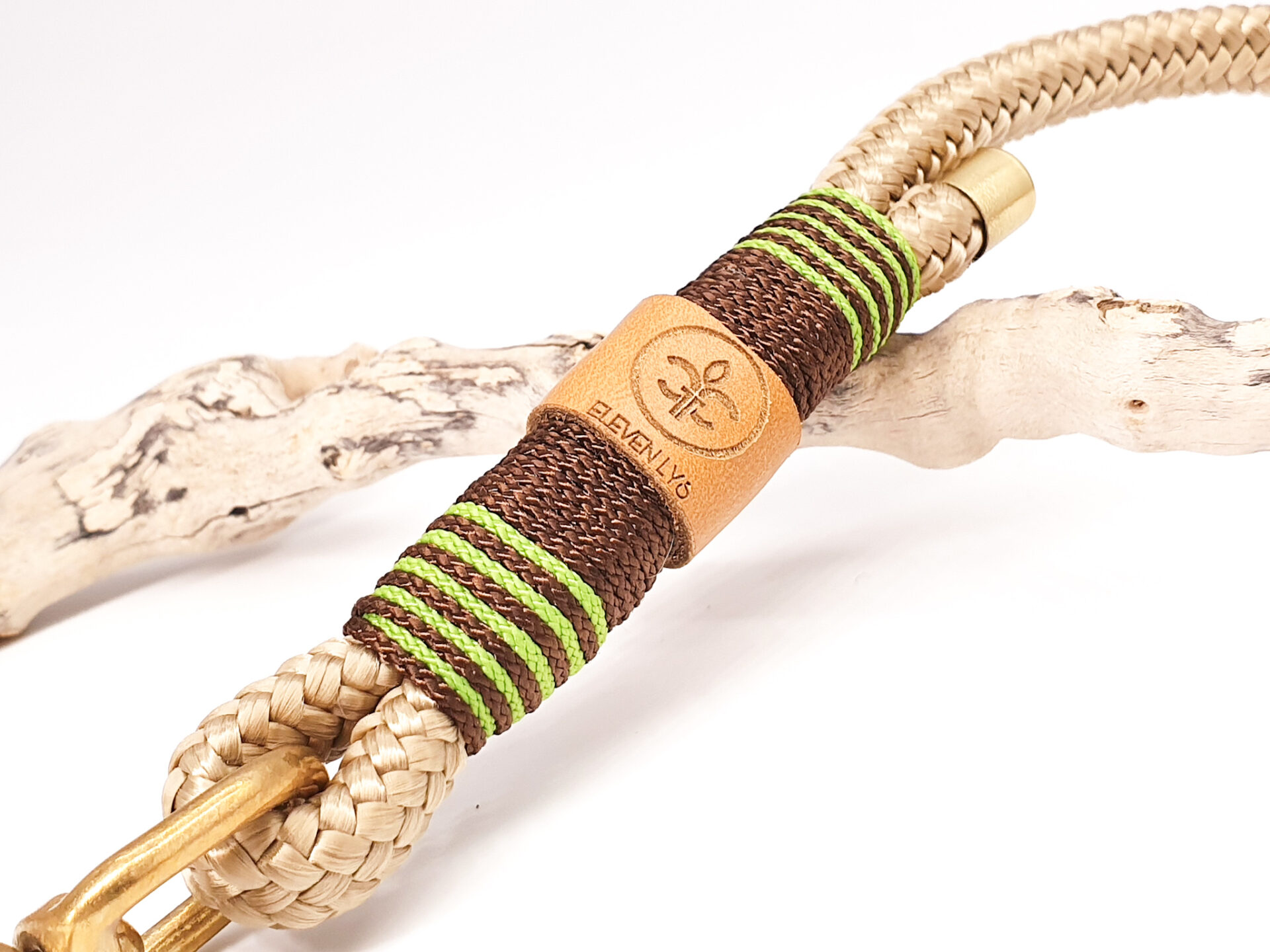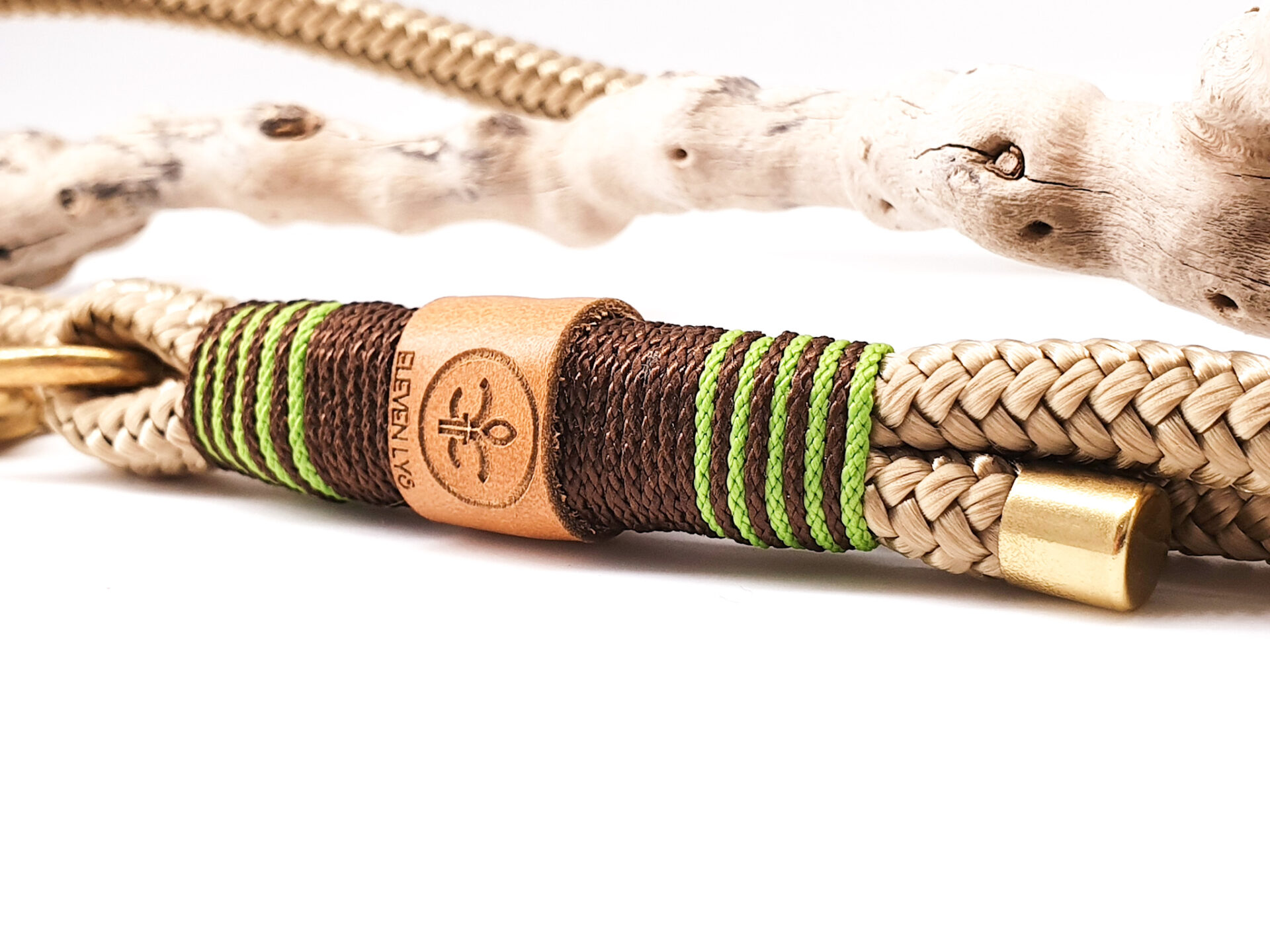 Das Seil ist in einem schönen BEIGE und die Takelung in einer schönen Streifen-Farbblock-Takelung in den Farben WALNUT und LEAF GREEN.