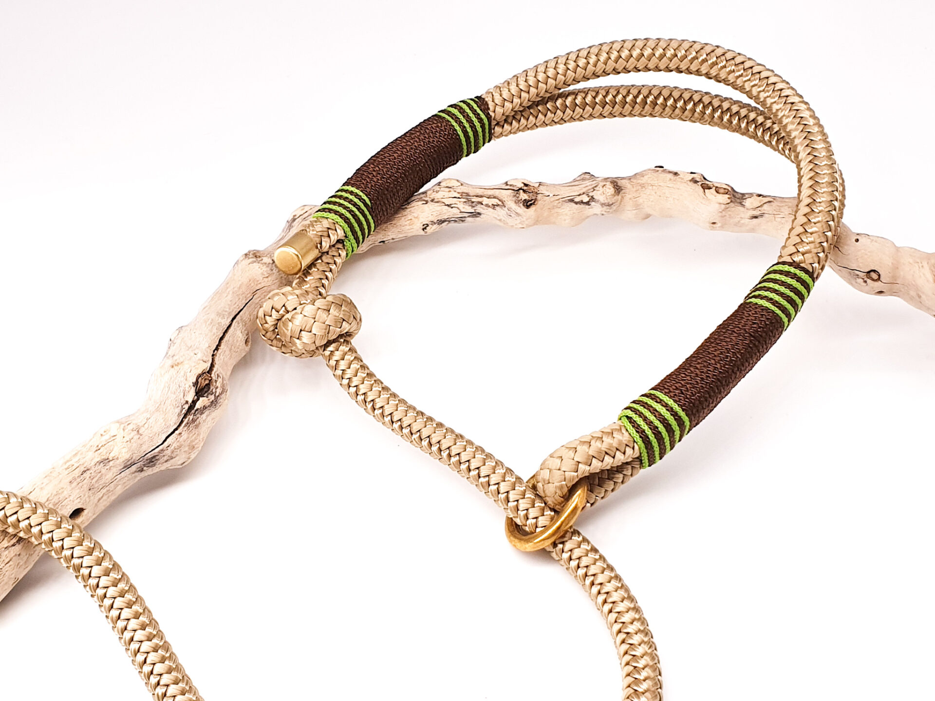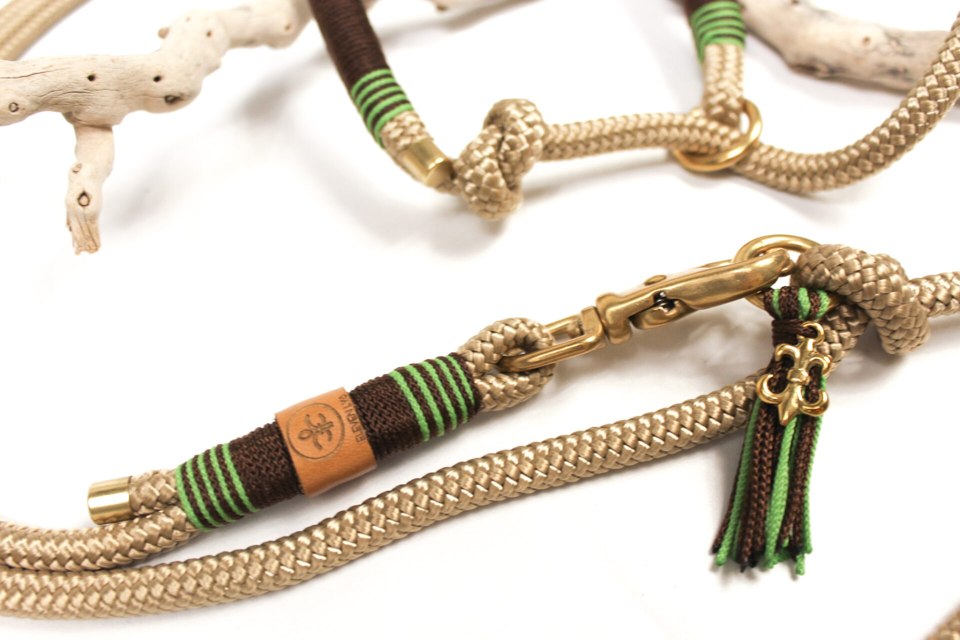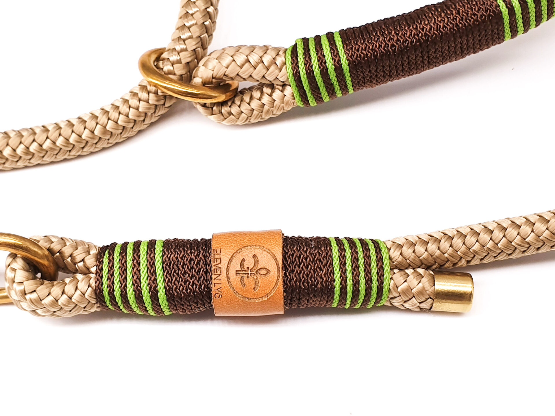Das Seil ist in einem schönen BEIGE und die Takelung in einer schönen Streifen-Farbblock-Takelung in den Farben WALNUT und LEAF GREEN.