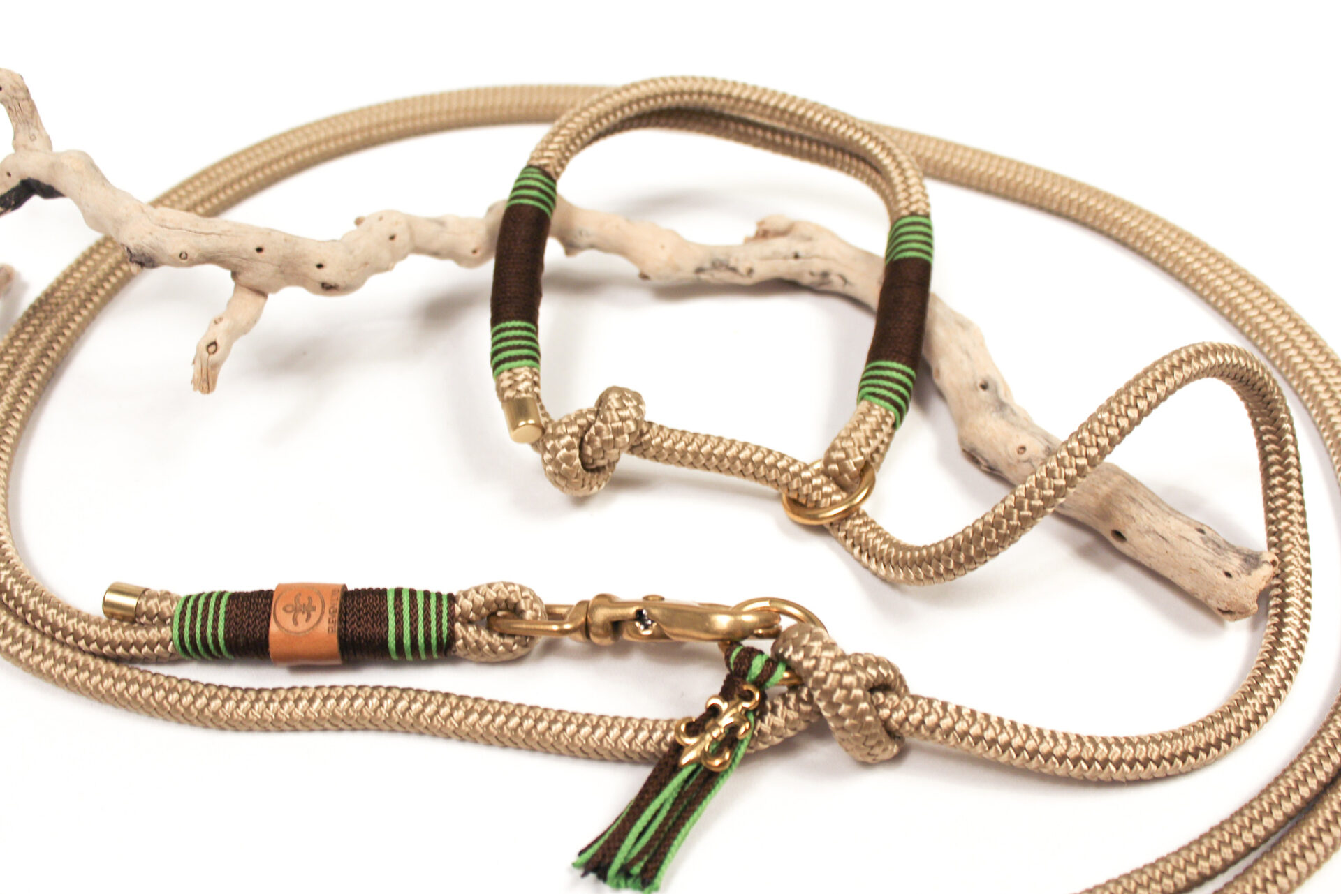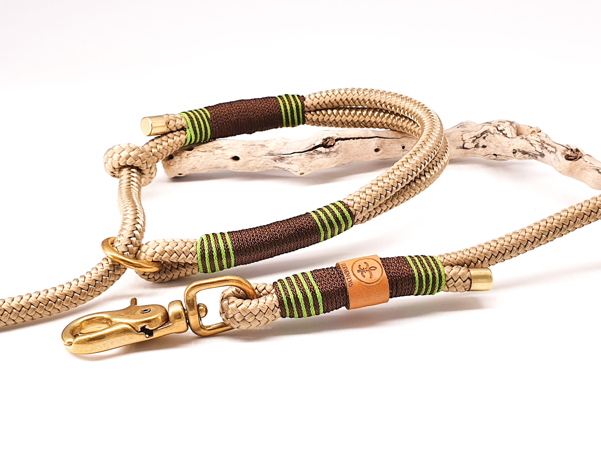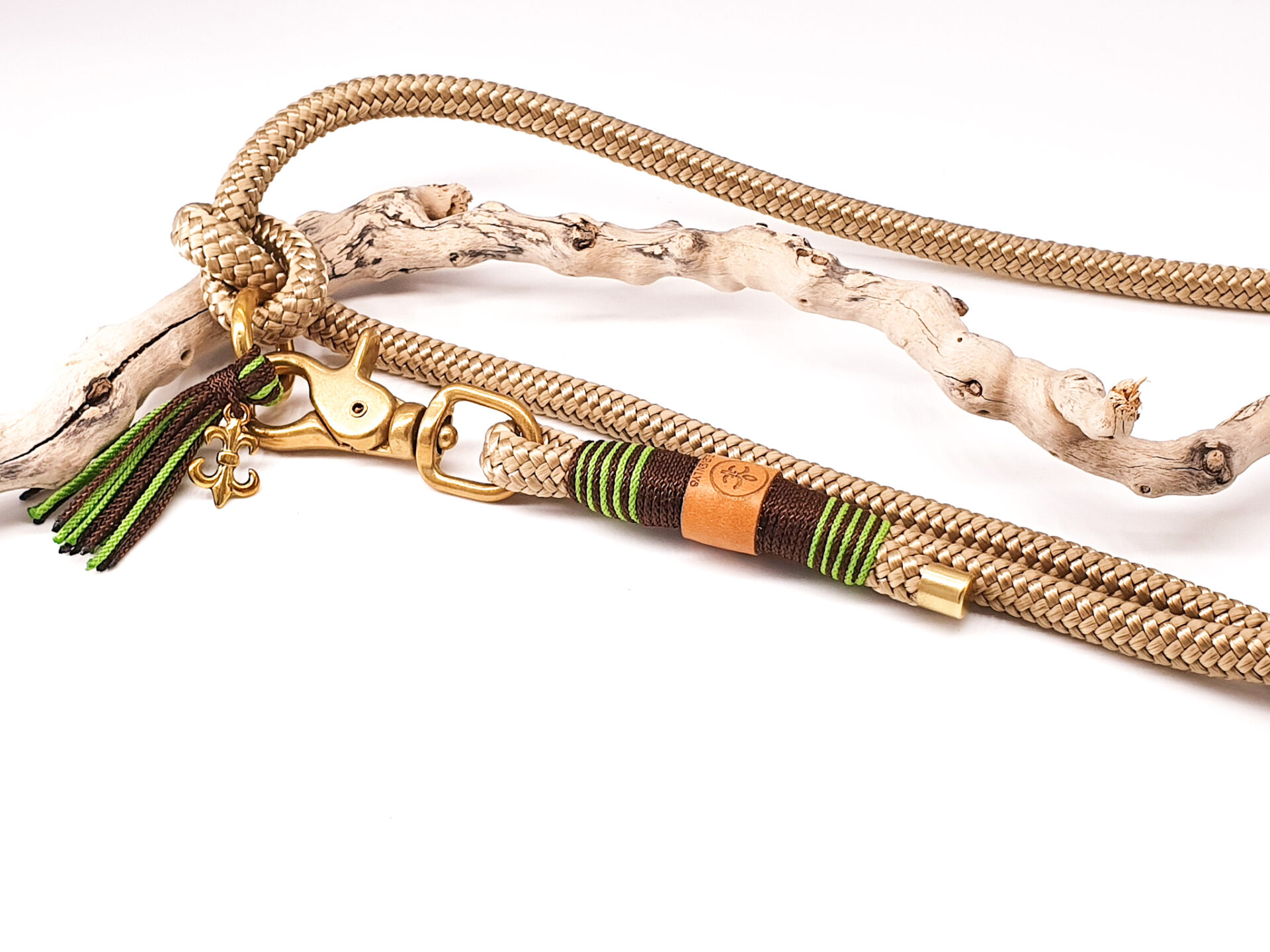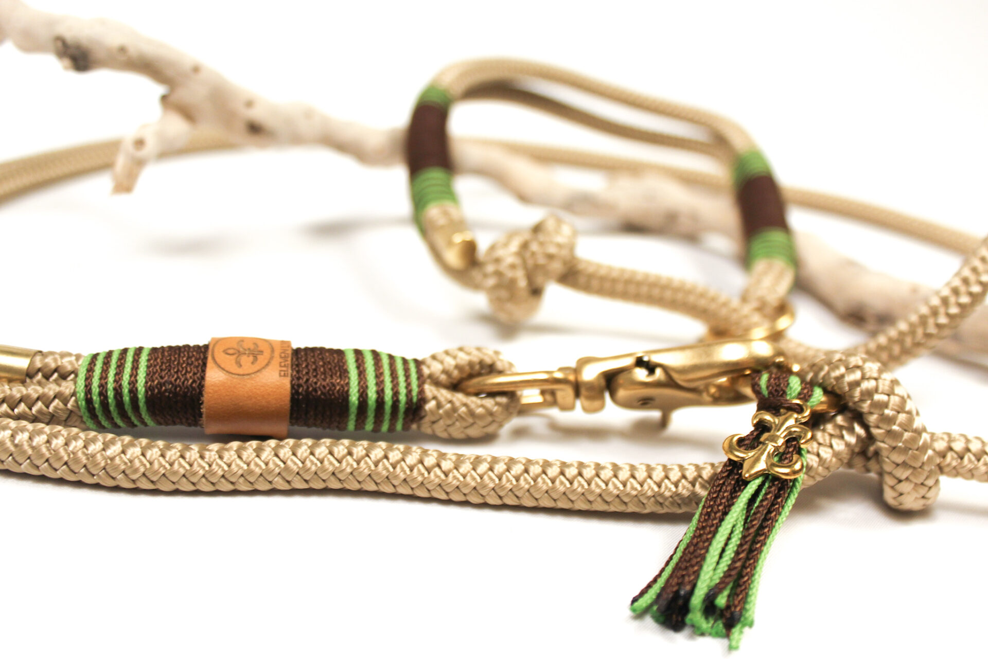 Das Seil ist in einem schönen BEIGE und die Takelung in einer schönen Streifen-Farbblock-Takelung in den Farben WALNUT und LEAF GREEN.