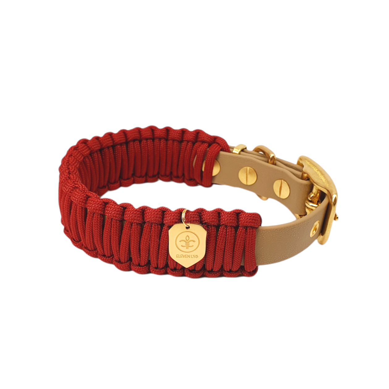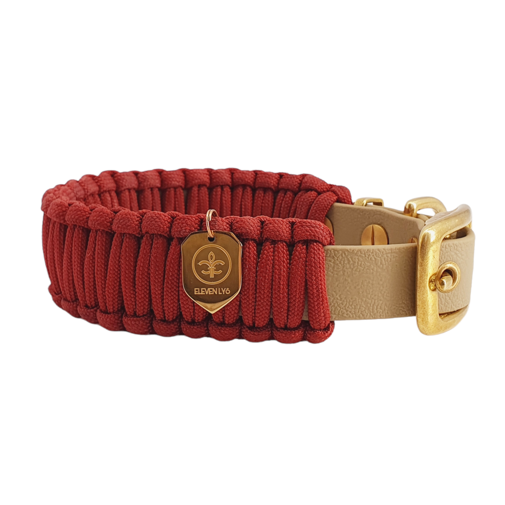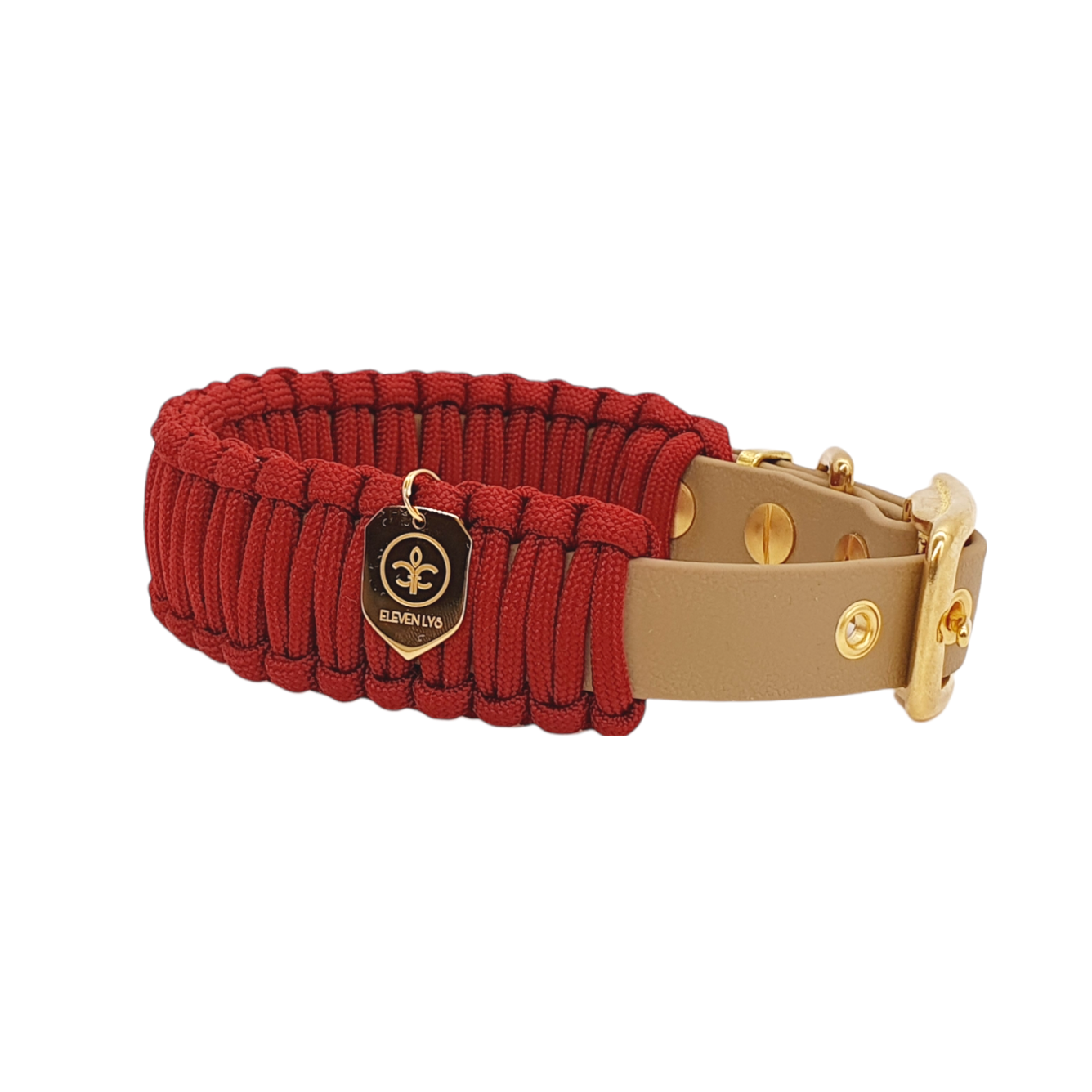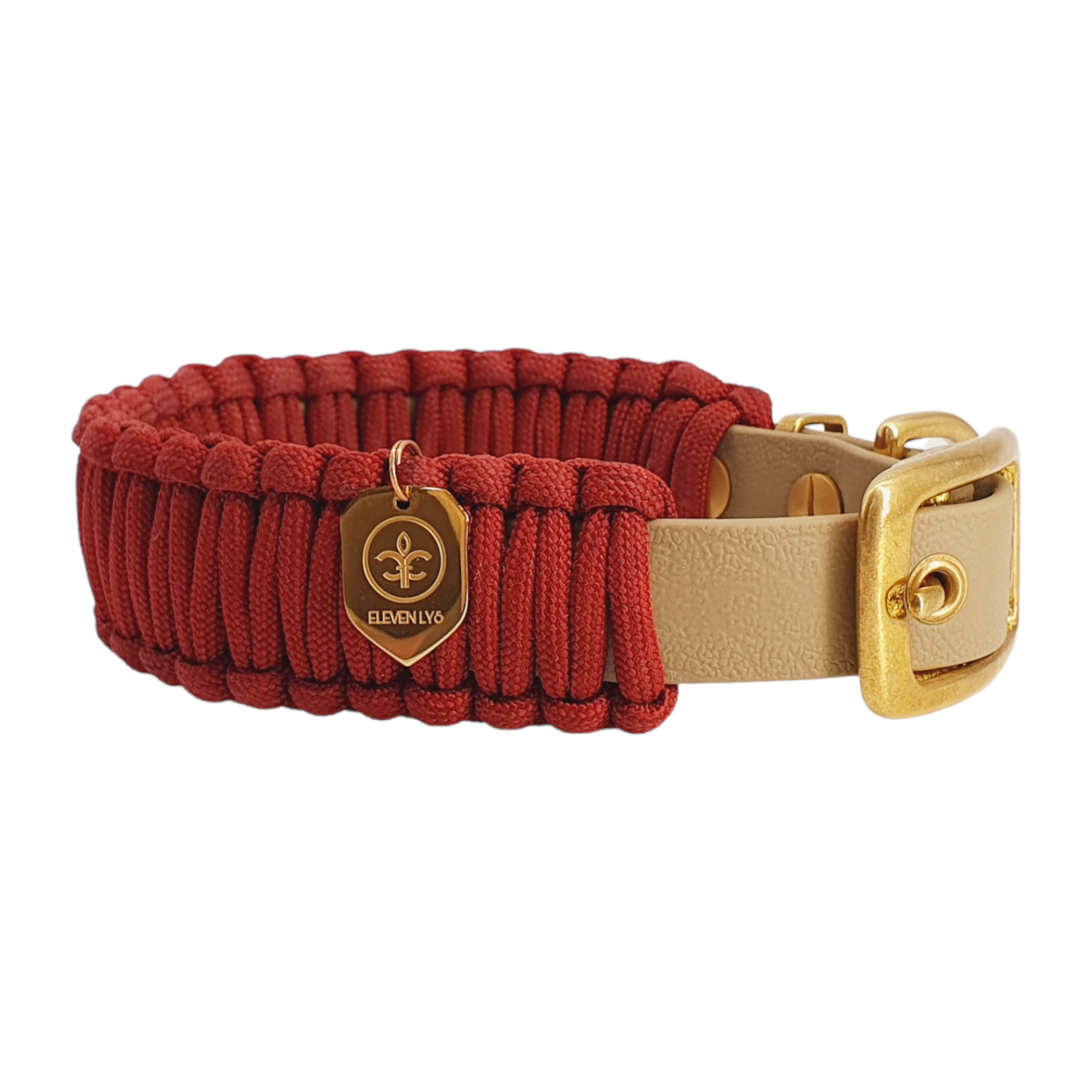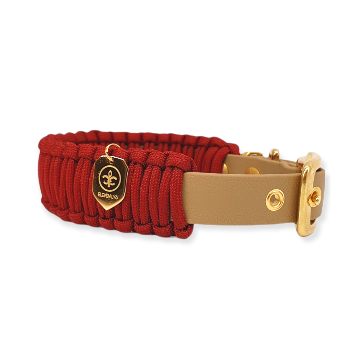 Wenn Du Dich für unser Biothane-Modell ROSE HIP LYS entscheidest, erhältst Du diese tolle Kombination aus Biothane in einem SANDTON und Paracord in einem BORDEAUX ROT.