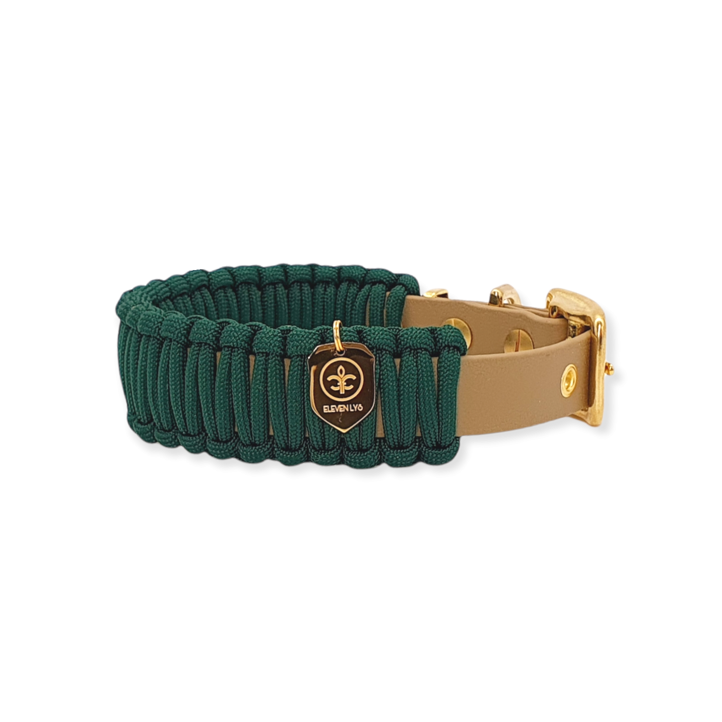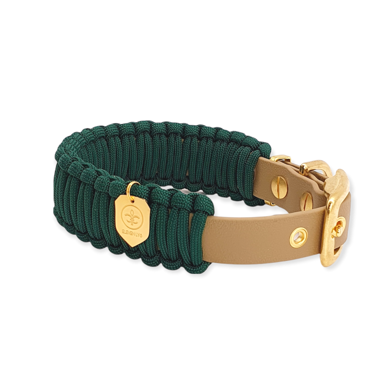 Wenn Du Dich für unser Biothane-Modell RIBBED LYS entscheidest, erhältst Du diese tolle Kombination aus Biothane in einem SANDTON und Paracord in dem eleganten EMERALD.