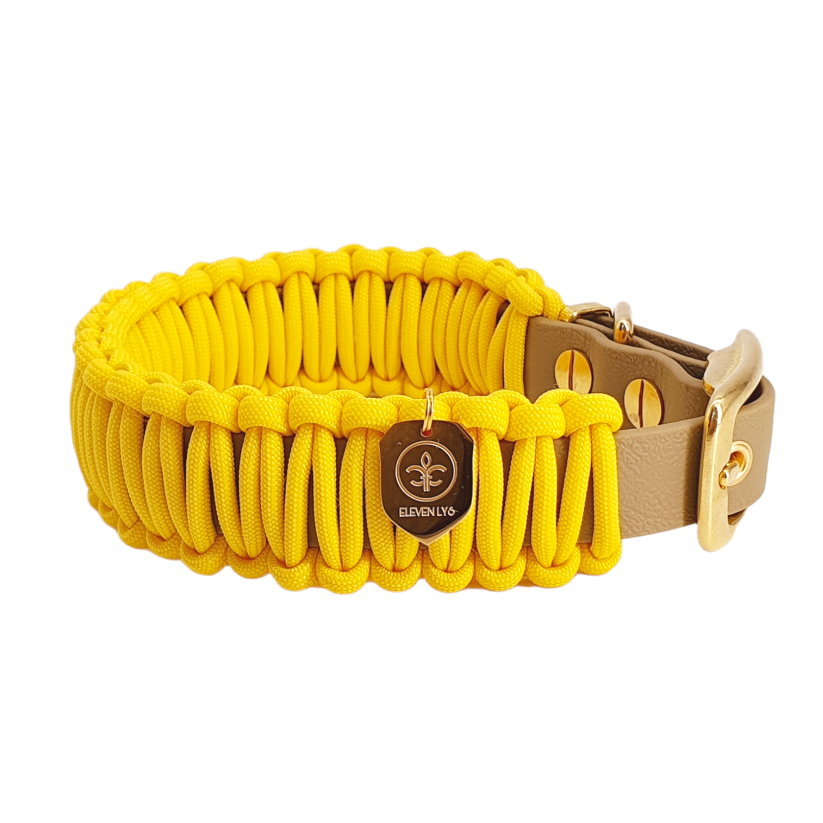 Wenn Du Dich für unser Biothane-Modell RIBBED LYS entscheidest, erhältst Du diese tolle Kombination aus Biothane in einem SANDTON und Paracord in dem eleganten GELB.